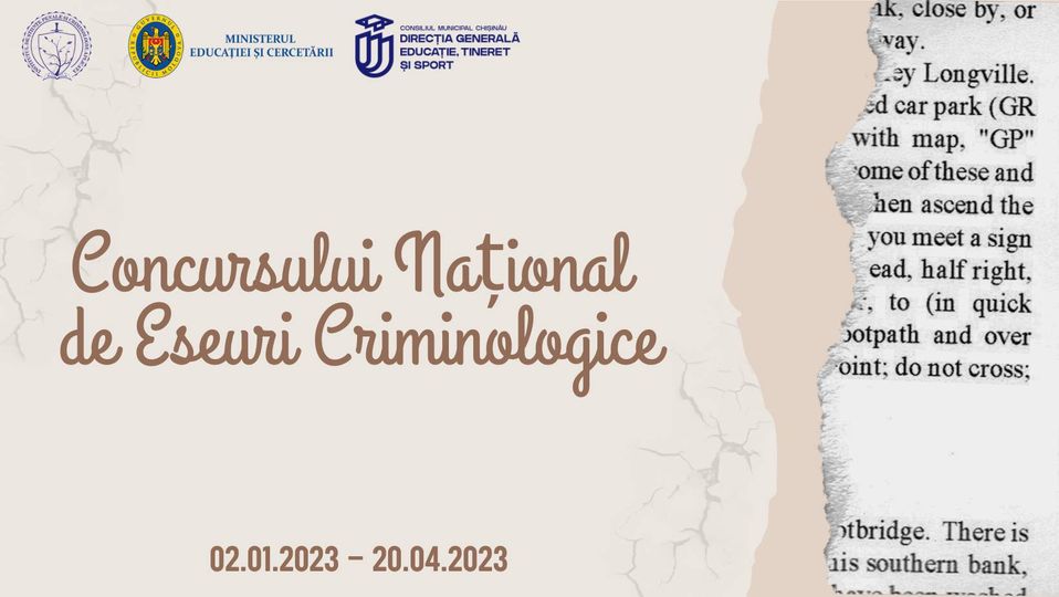 Direcția Generală Educație, Tineret și Sport a Consiliului municipal Chișinău informează că în perioada 02.01.2023 – 20.04.2023, Institutul de Științe Penale și Criminologie Aplicată, sub patronatul Ministerului Educației și Cercetării, va desfășura a X-a ediție a Concursului Național de Eseuri Criminologice cu genericul “Tineretul pentru un viitor prosper, fără crime, corupție și violență”.