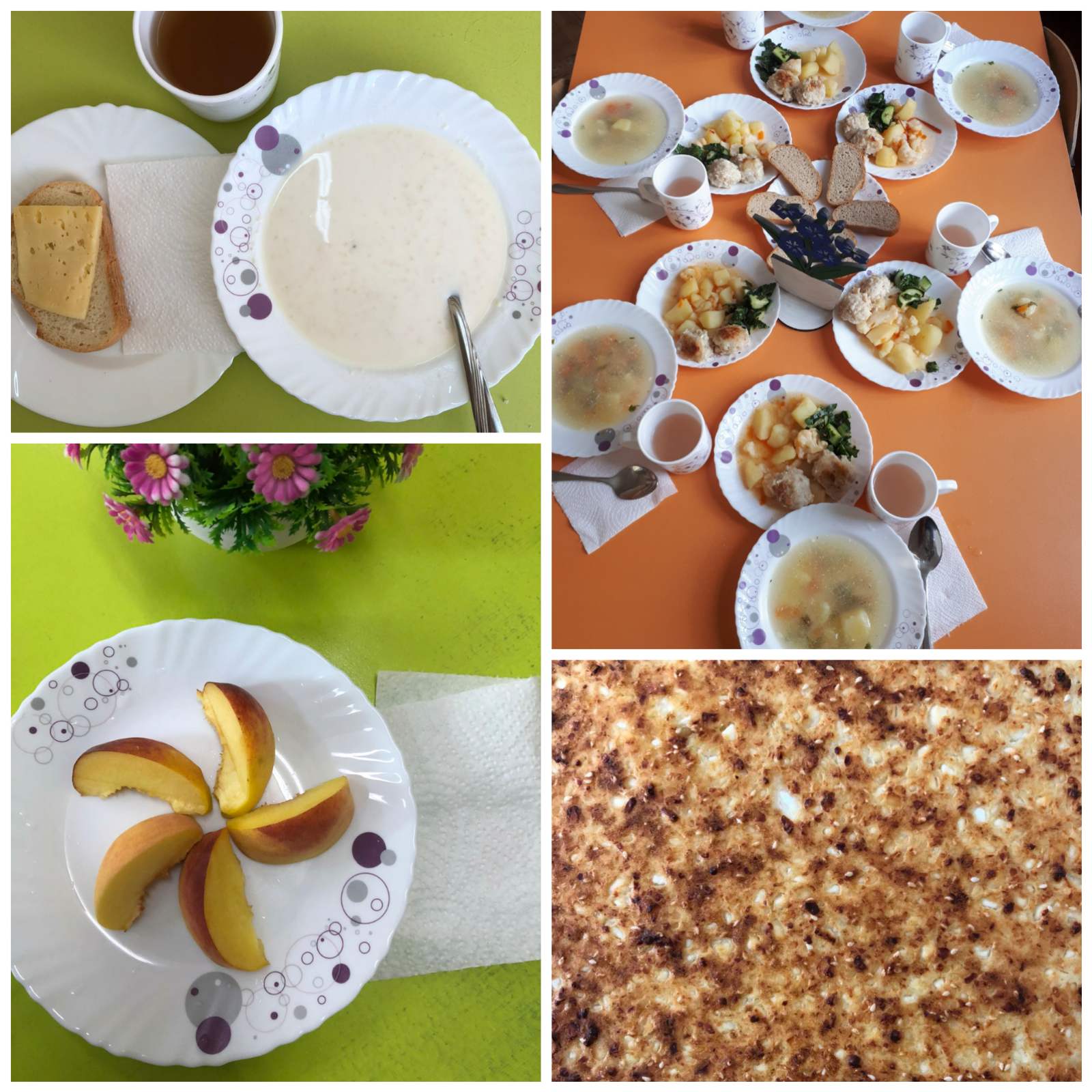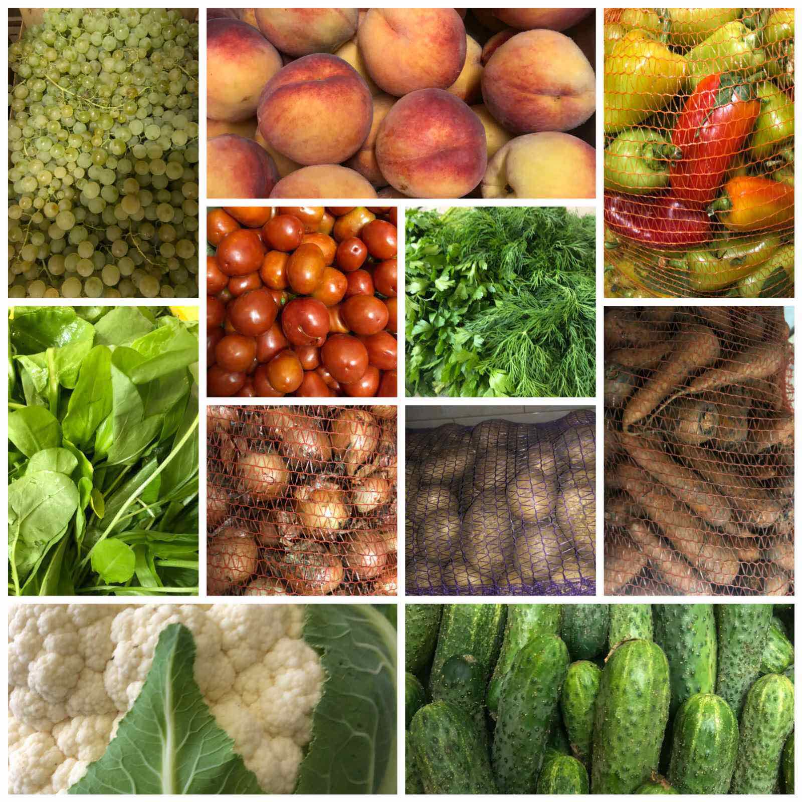 -Fructe, legume și verdețuri proaspete de sezon: piersici, struguri de poamă, pătrunjel, măcriș, spanac, ciapă, cartofi, morcov, ardei dulci, roșii și castraveți