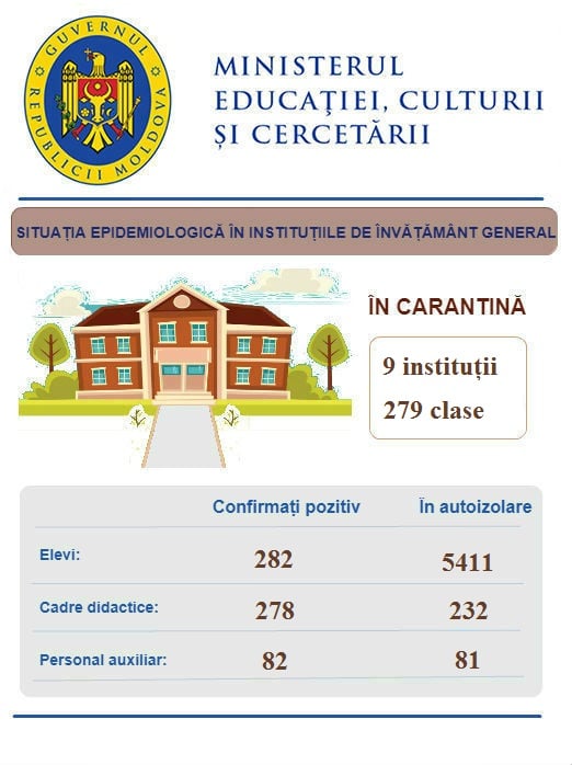 Conform ultimelor date actualizate, la data de 12 februarie, 9 instituții de învățământ general din țară activează la distanță din cauza carantinei ca și în cazul a 279 de clase. Numărul elevilor testați pozitiv cu COVID-19 este de 282, iar 5411 elevi au fost plasați în regim de autoizolare. 278 de cadre didactice au fost confirmate pozitiv cu noul Coronavirus și 232 se află în izolare. Din personalul nedidactic și auxiliar au fost infectate cu noul virus 82 de persoane, iar alte 81 se află în autoizolare.
