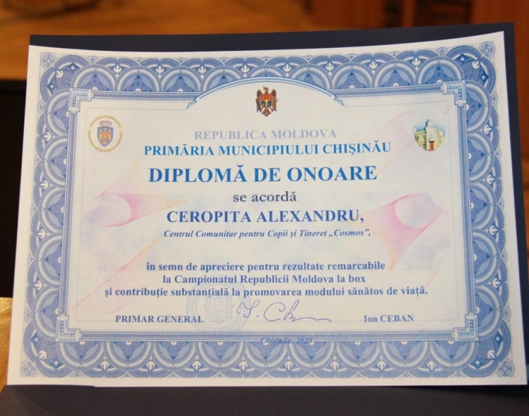 Primarul general, Ion Ceban, a înmânat astăzi diplome de onoare ale Primăriei municipiului Chișinău la 16 copiii din cadrul Centrului Comunitar pentru Copii și Tineri „Cosmos”. Evenimentul a fost prilejuit de rezultatele remarcabile obținute de către aceștia la Campionatul Republicii Moldova la Box și contribuția substanțială la promovarea unui mod sănătos de viață.