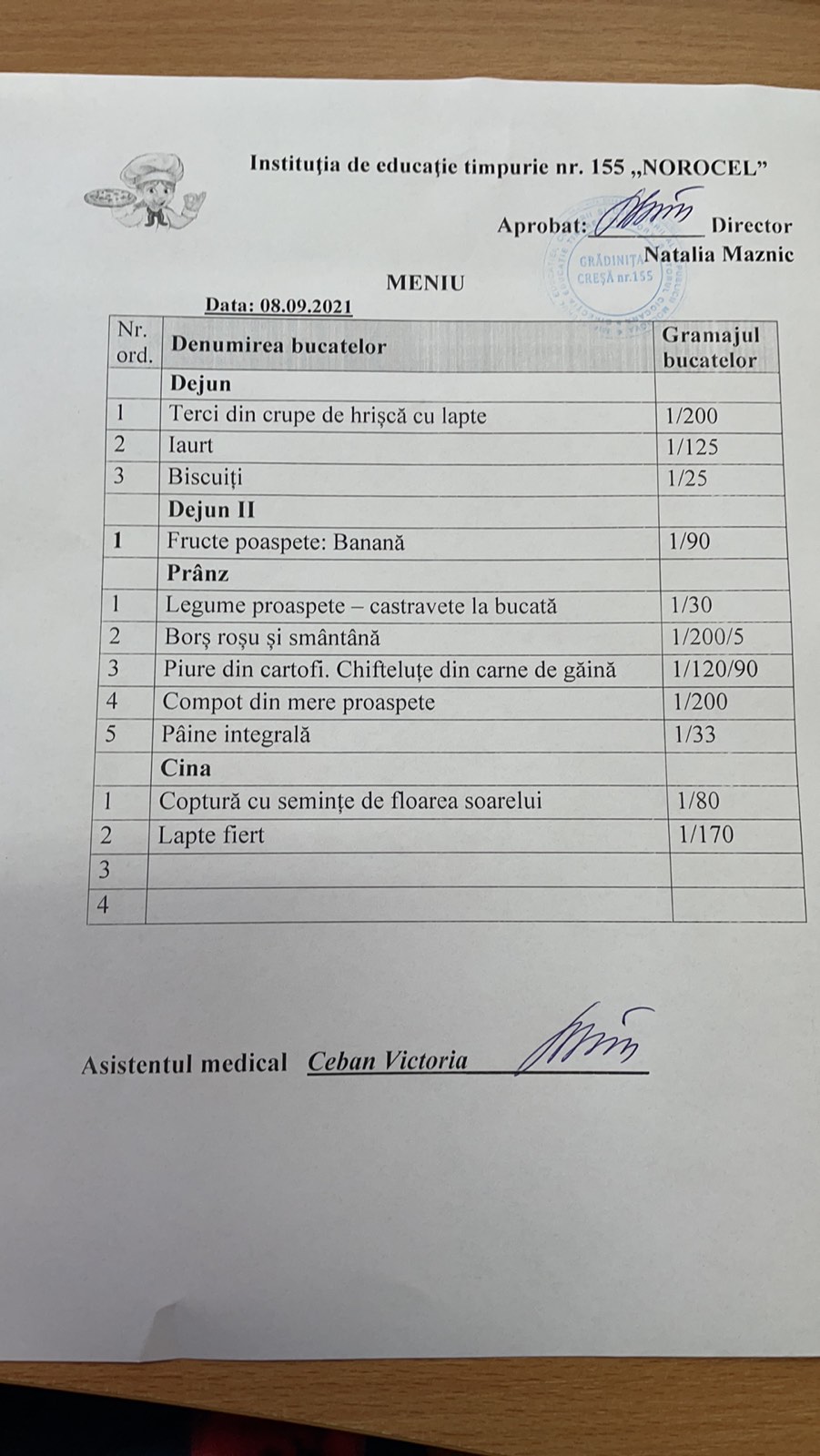 Instituția de educație timpurie nr.155 ,,Norocel”, str. Igor Vieru 5/2, asigură zilnic o alimentație de calitate, respectând Meniul model – unic, aprobat de CSP. Toate produsele livrate în instituție sunt de calitate, în ambalaj, pe care este indicat termenul de valabilitate. IET nr.155 dispune de condiții moderne pentru păstrarea produselor, fiind dotată cu camera frigorifică și frigidere conform cerințelor sanitaor – igienice și de utilaj tehnologic modern pentru prepararea bucatelor. Bucătarii prepară bucatele zilnic cu multă grijă și dragoste pentru copilași. Ele fiind gustoase, aromate și apetisante, trezind pofta copilașilor de a le consuma. Astfel, responsabilii pentru organizarea procesului de alimentaie în IET nr.155 respectă cu strictețe cerințele actelor normative cu privire la alimentația copiilor.
