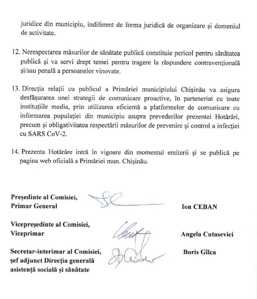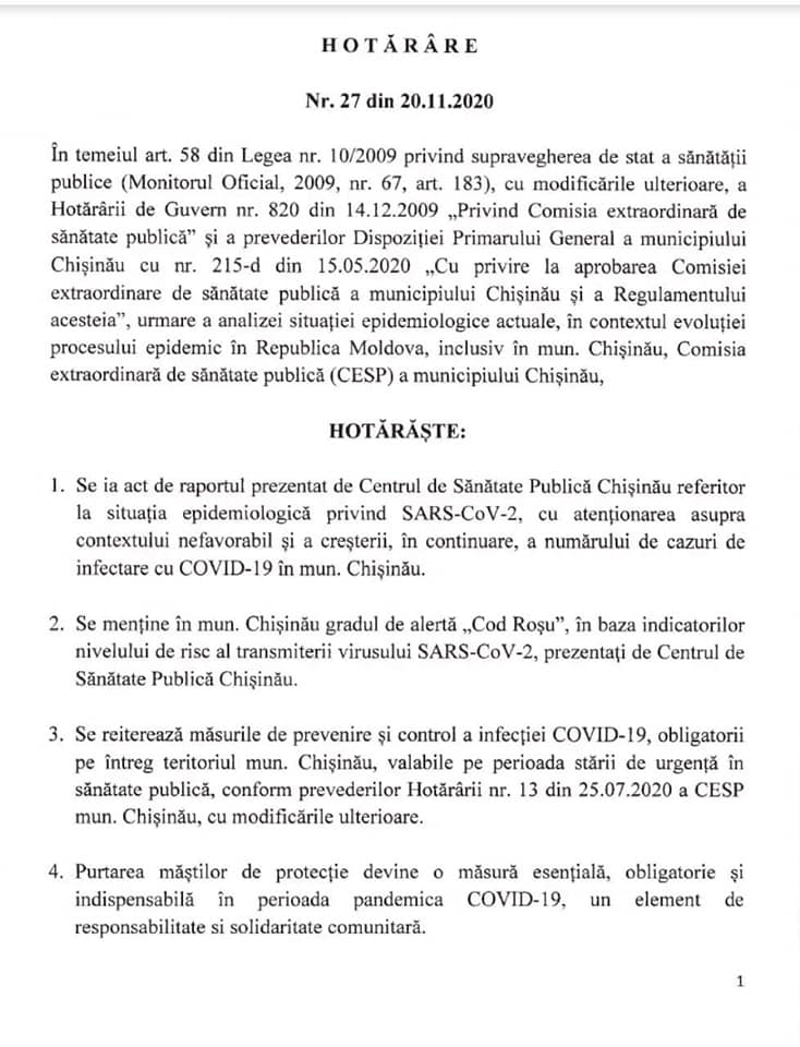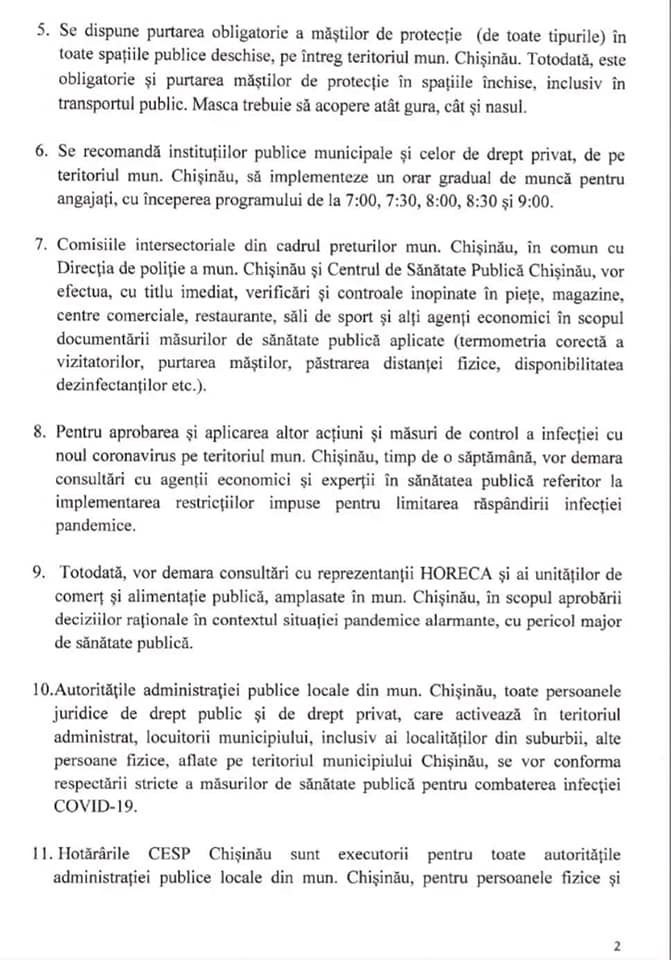 De asemenea, este obligatorie și purtarea măștilor de protecție în spațiile închise, inclusiv în transportul public. Masca trebuie să acopere atât gura, cât și nasul, se precizează în hotărârea CESP Chișinău.
