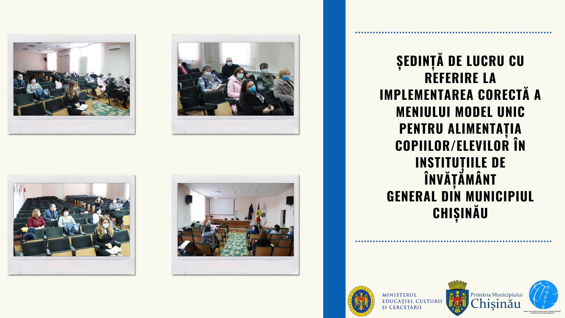 Astăzi, 21 ianuarie 2021, Direcția Generală Educație Tineret și Sport a Consiliului municipal Chișinău a organizat o ședință de lucru cu referire la implementarea corectă a meniului model unic pentru alimentația copiilor în instituțiile de învățământ preșcolar din municipiul Chișinău.