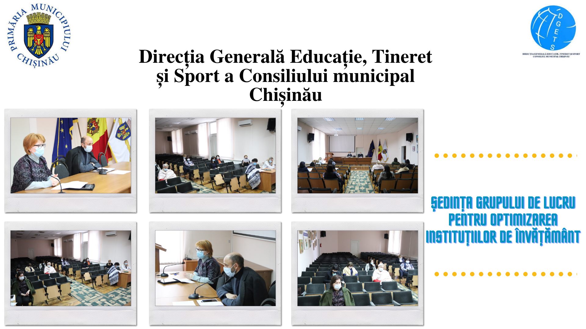 Astăzi, 04 noiembrie 2020, Direcția Generală Educație, Tineret și Sport a Consiliului municipal Chișinău, a organizat ședința grupului de lucru pentru reorganizarea și optimizarea a instituțiilor de învățământ din municipiul Chișinău. Menționăm că recent #DGETS a efectuat o amplă analiză a situației rețelei școlare din municipiu, urmărind evoluția numărului de elevi, clase și instituții de învățământ primar și secundar, general, pe perioada ultimilor trei ani. Astfel, fiind evaluată funcționalitatea instituțiilor de învățământ este evidentă necesitatea reorganizării și optimizării a acestora.