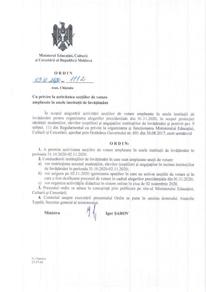 În scopul asigurării activității secțiilor de votare amplasate în unele instituții de învățământ pentru organizarea alegerilor prezidențiale din 01.11.2020, protecției sănătății elevilor/copiilor și angajaților instituțiilor de învățământ, conducătorii instituțiilor de învățământ general din municipiul Chișinău, în care sunt amplasate secții de votare, vor asigura: